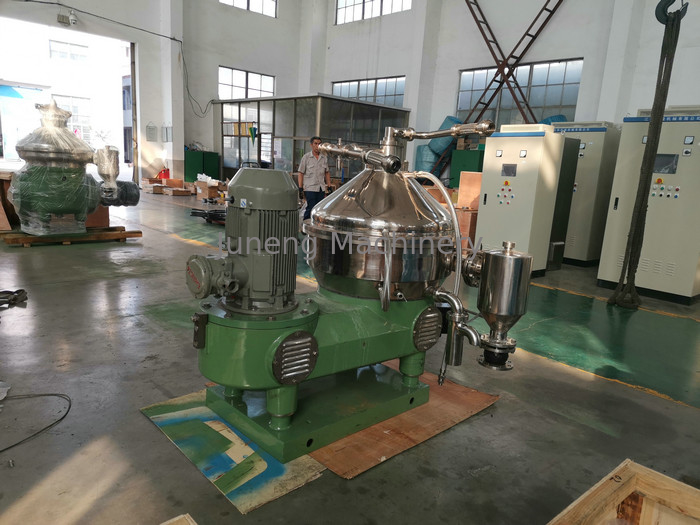 El cuenco es conducido por el motor con los pares del engranaje del embrague y del tornillo de fricción y gira en la velocidad alrededor del árbol principal. El líquido común fluye de la entrada de carga de centro en el top del separador a la parte inferior a través del tubo de carga y después pasa a través de asientos del disco al espacio del cuenco. Las partículas más grandes de la fase sólida de la gravedad en el líquido común se establecen abajo a la pared del cuenco bajo acción de la fuerza centrífuga y salido hacia fuera del residuo bajo el control del cuenco lateral, la fase líquida se establece completamente abajo al centro a lo largo de los discos y es drenada hacia fuera por la bomba centrípeta.