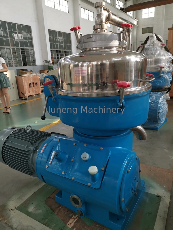 El material separado entra en el tambor del separador, y bajo campo de fuerza centrífuga fuerte, el material incorpora el intervalo de la separación de un grupo de paquetes del disco del extremo grande del disco. El sólido con una proporción más grande se mueve a lo largo de la pared del disco hacia el extremo grande, acumulando en el área del sedimento, y es descargado continuamente de la máquina por la boca. El líquido con movimientos más pequeños de una gravedad específica a lo largo de la pared del disco hacia el pequeño extremo del disco, convergiendo en la bomba centrípeta en la cima del tambor, y haciendo salir de la bomba centrípeta al proceso siguiente. La presión de la salida máxima puede alcanzar 0.30MPa.